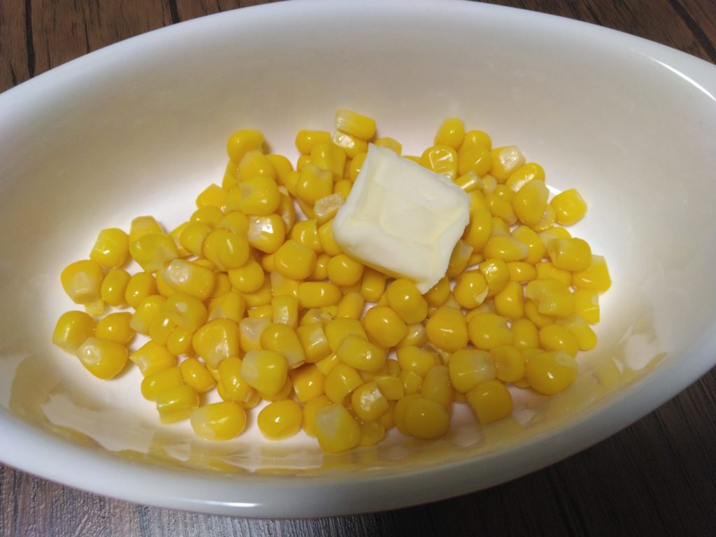 1.コーンを耐熱皿に入れ、バターをのせて軽くラップをかけてレンジで30~40秒くらい温めます。