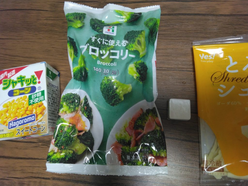 2.次に解凍したブロッコリーをコーンの皿に入れ、一緒にかき混ぜます。