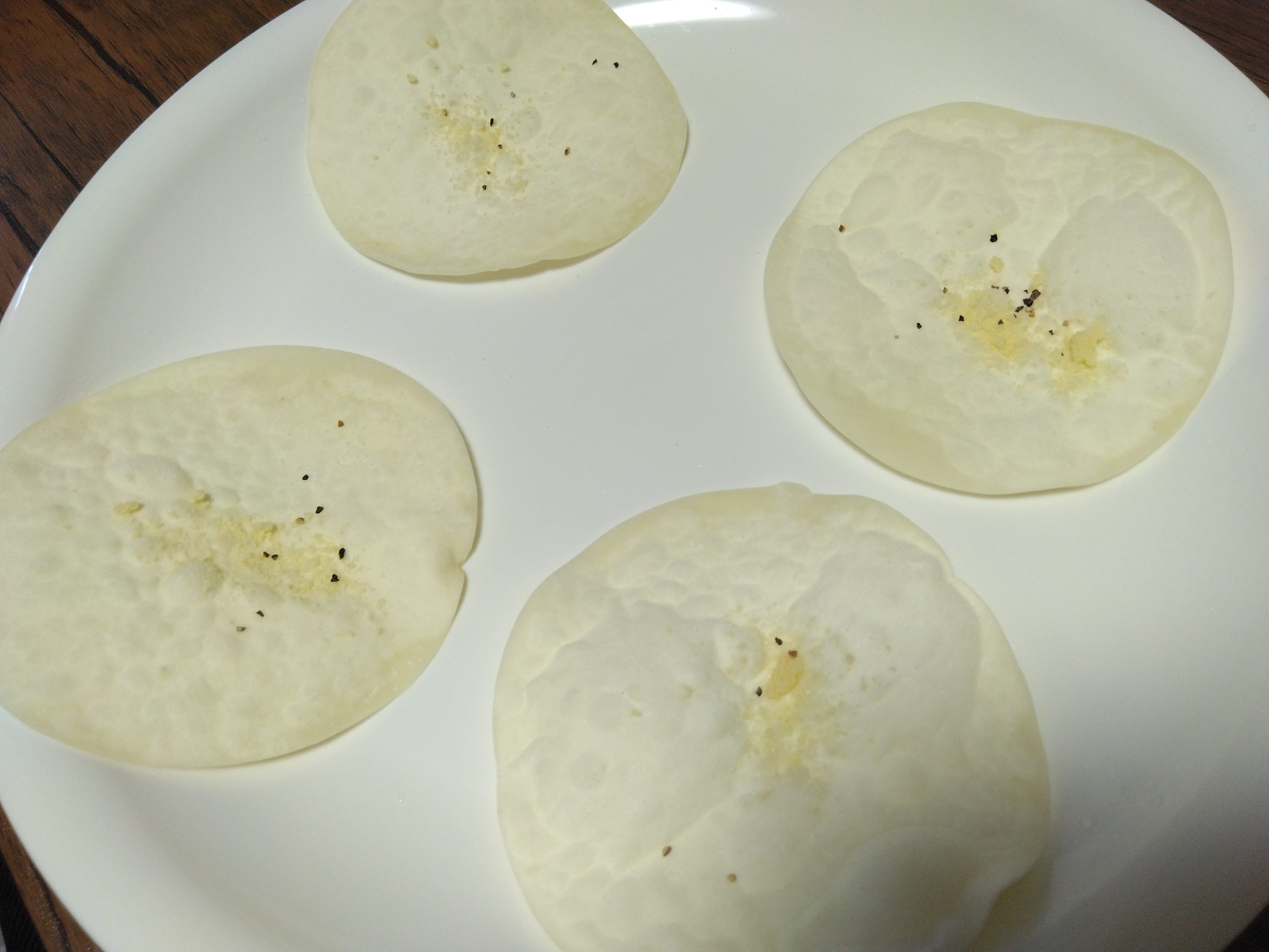 まず、お皿の上に餃子の皮を、他とくっつかないように並べ、粉チーズをかけます。