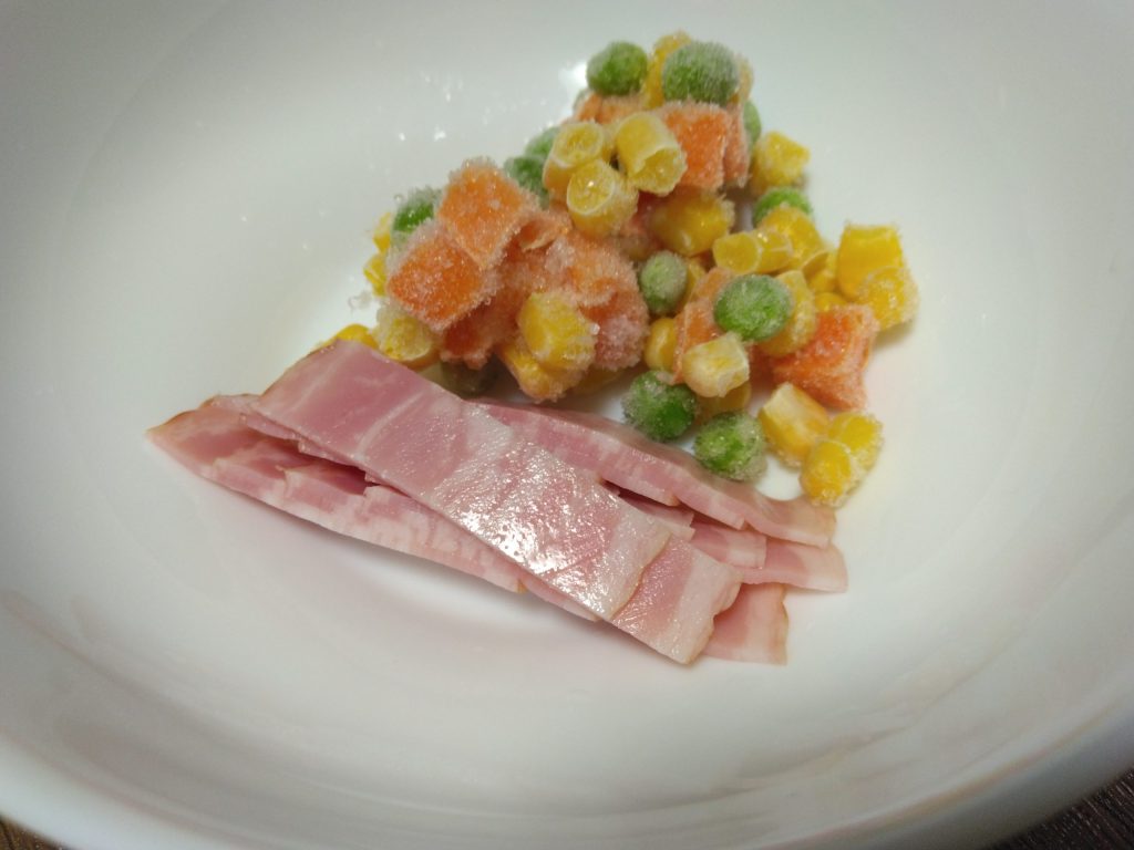 まず、耐熱容器にミックスベジタブルと細かく切ったベーコンを入れます。