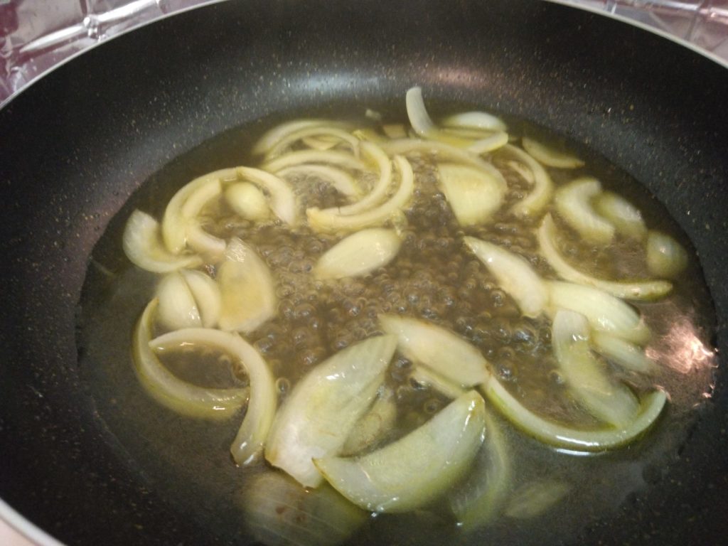 1.タマネギをくし切りにして、フライパンにオリーブオイルをひき、色が変わるまで炒めます。