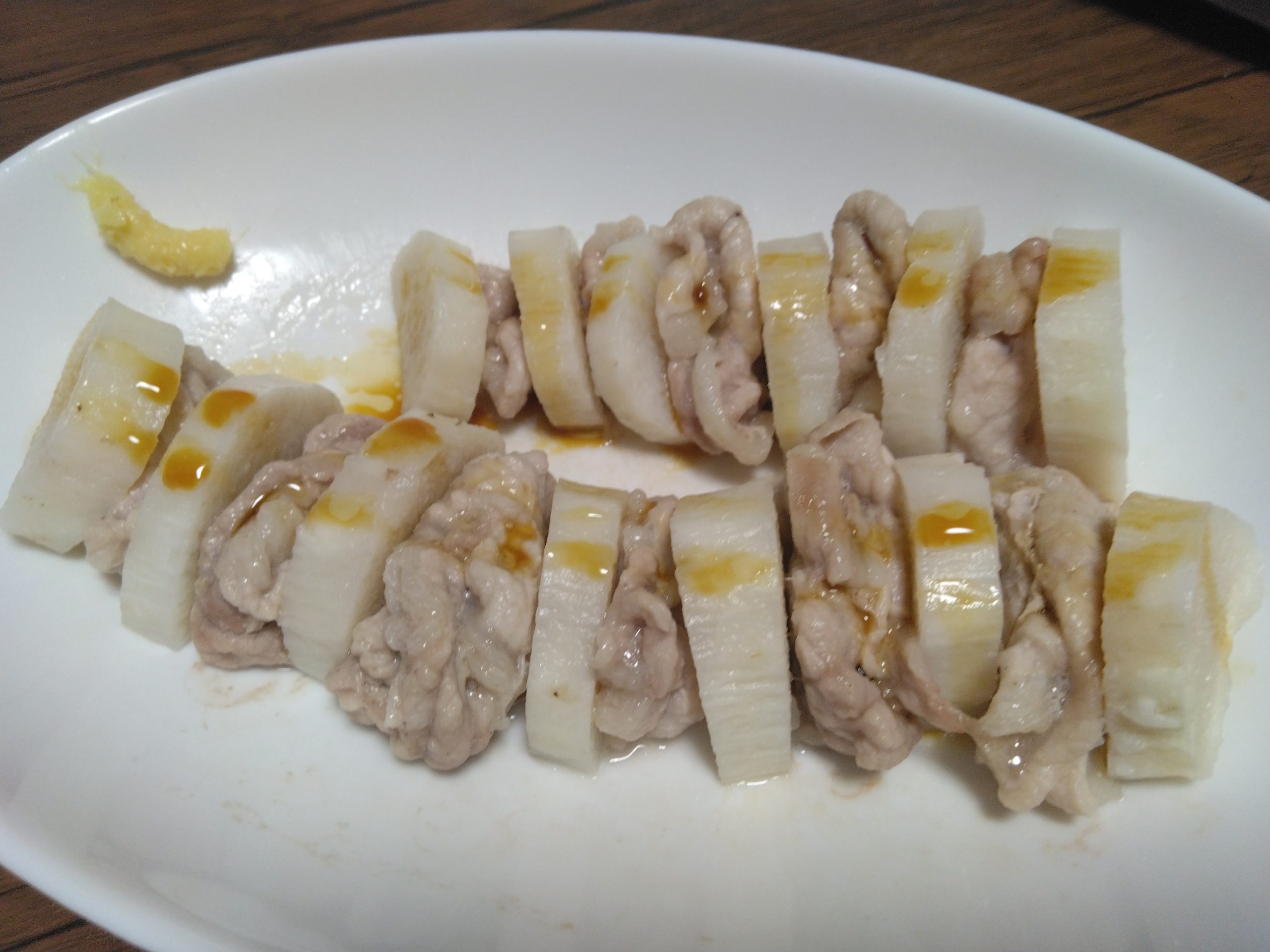 切った長芋と豚肉を交互に並べた後、ラップをしてレンジで6分温めるだけです(600w)