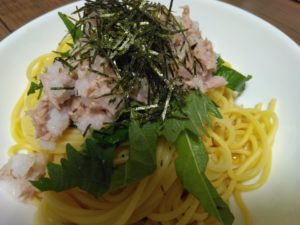 パスタの上に、  青じそ、 ツナと大根おろし、きざみ海苔をのせて完成です!!