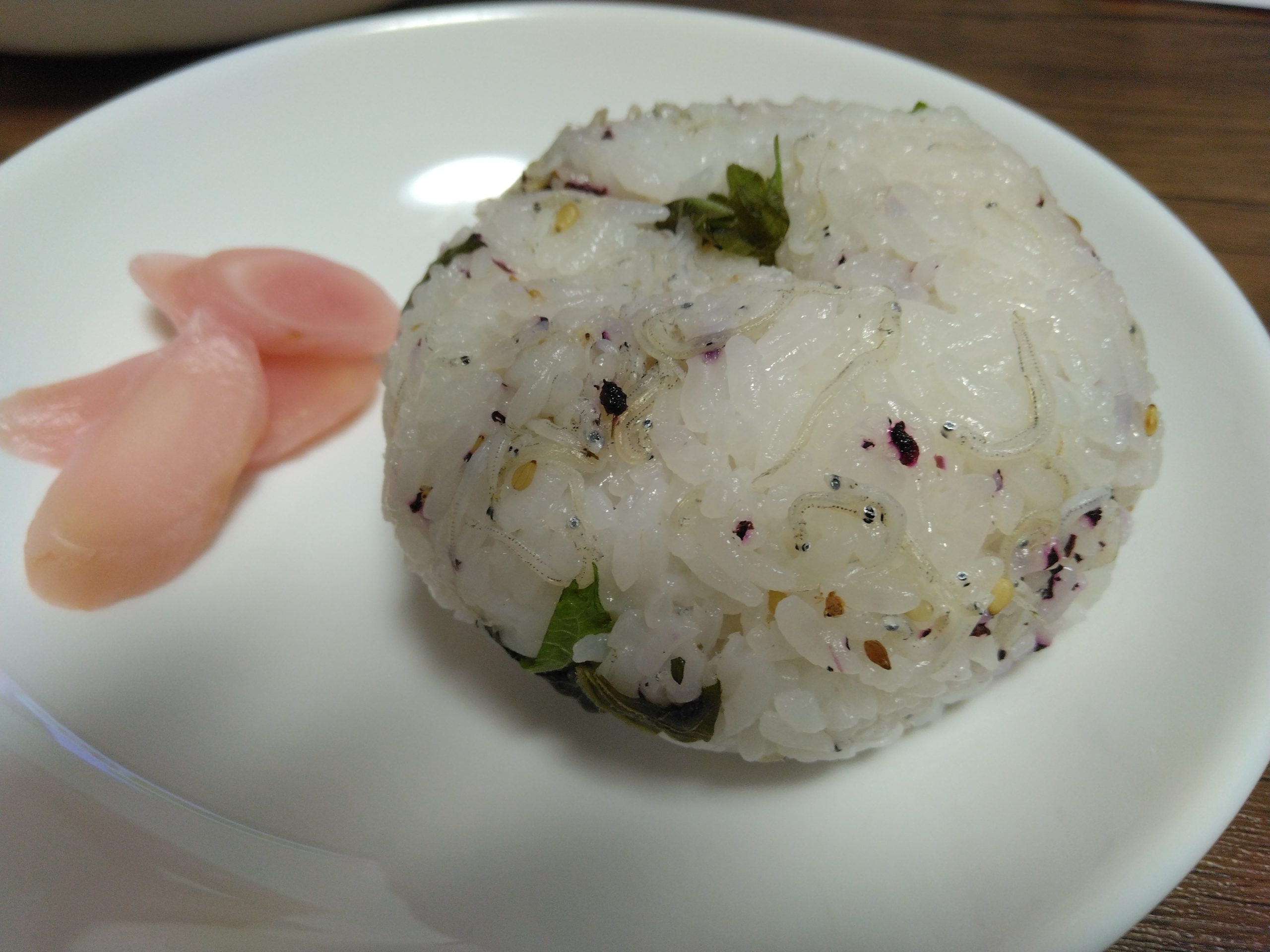 ゆかりとしらす干しと大葉~白ごまとごま油で作る簡単おにぎり