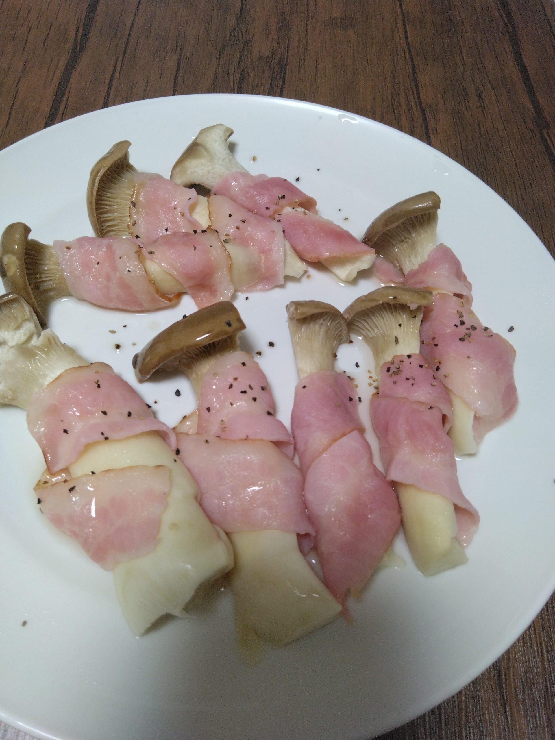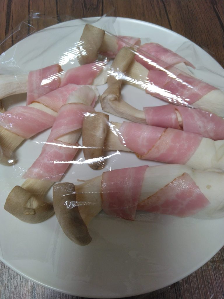 エリンギを8等分に割き、ベーコンを巻きつけます。この時、終わりと始まりが、なるべく下に来るように置きます。