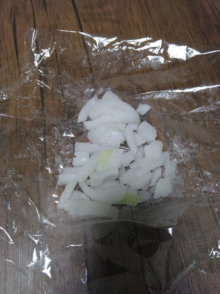 冷凍タマネギをラップの上に出し、ラップで包み、大きいものは砕きます。