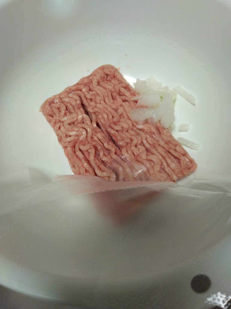 ①合い挽き肉 200グラム(スーパーに合い挽き肉が無かったので、今回は豚ひき肉を使いました)