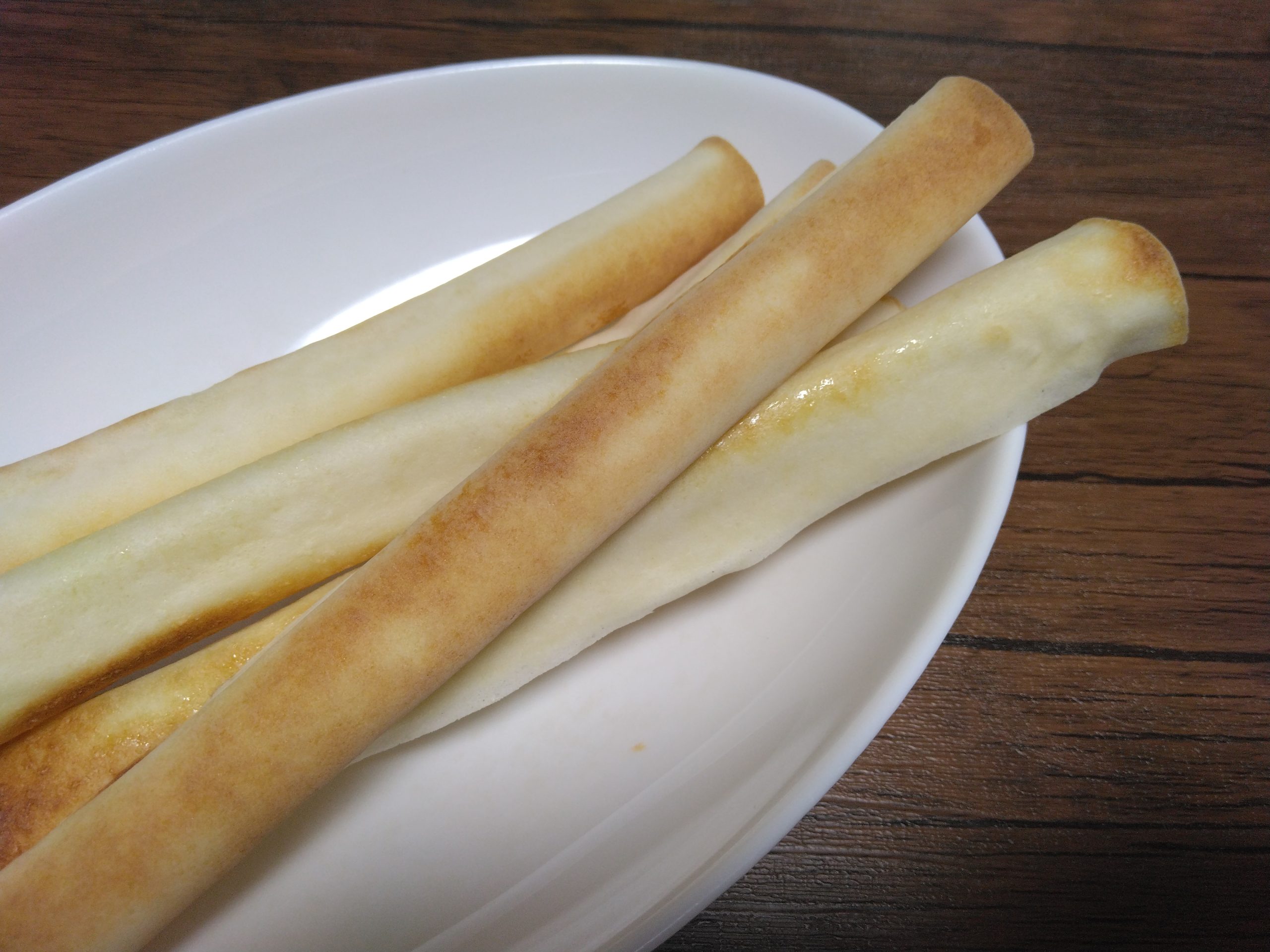 作り方は簡単。春巻きの皮の真ん中と端にバターを塗ってクルクル巻くだけ。