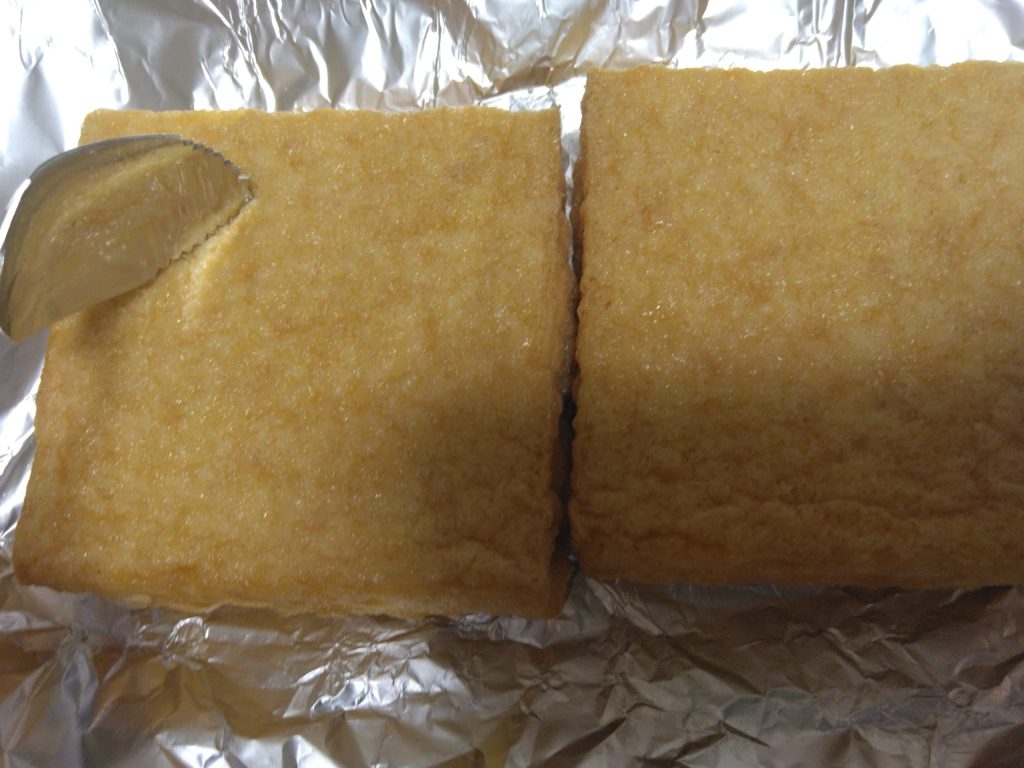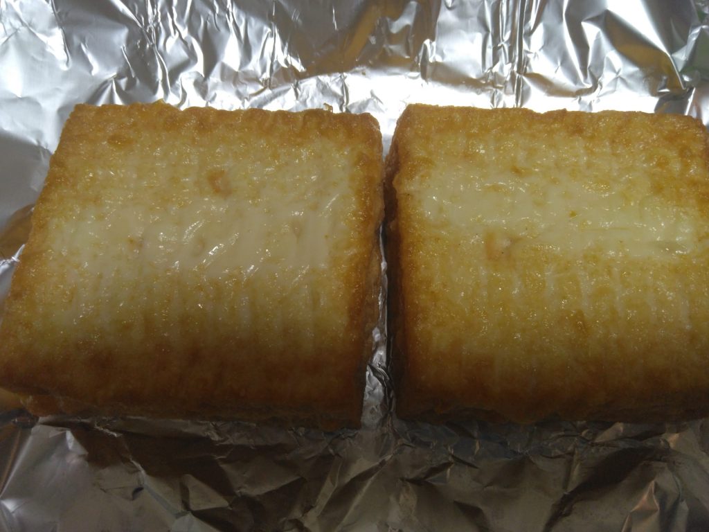 厚揚げは、片面だけ焼くと底が冷たいままなので、温かいのがいい人は、底の部分を焼いてから、割り箸か手でひっくり返した方がいいと思います。