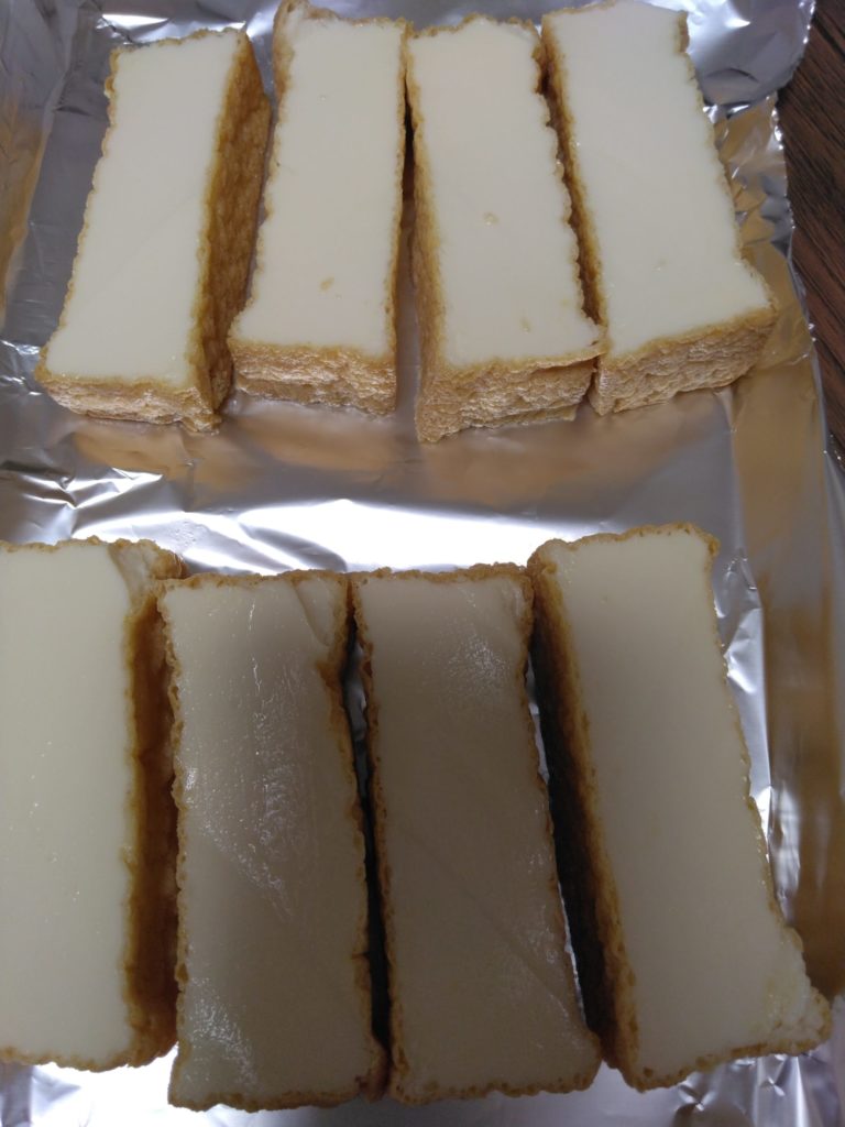 次に、厚揚げをそれぞれ4等分にしてアルミホイルの上にのせます。