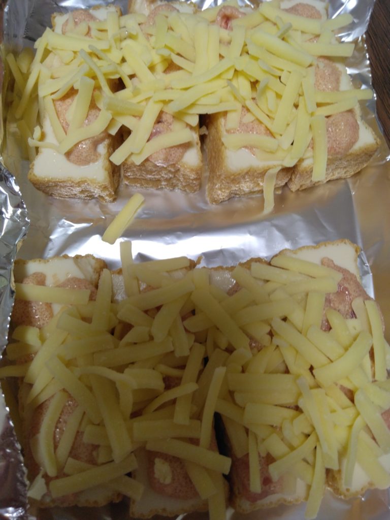 先ほど作った明太ソースを厚揚げの上にのせ、チーズを更にその上にのせます。